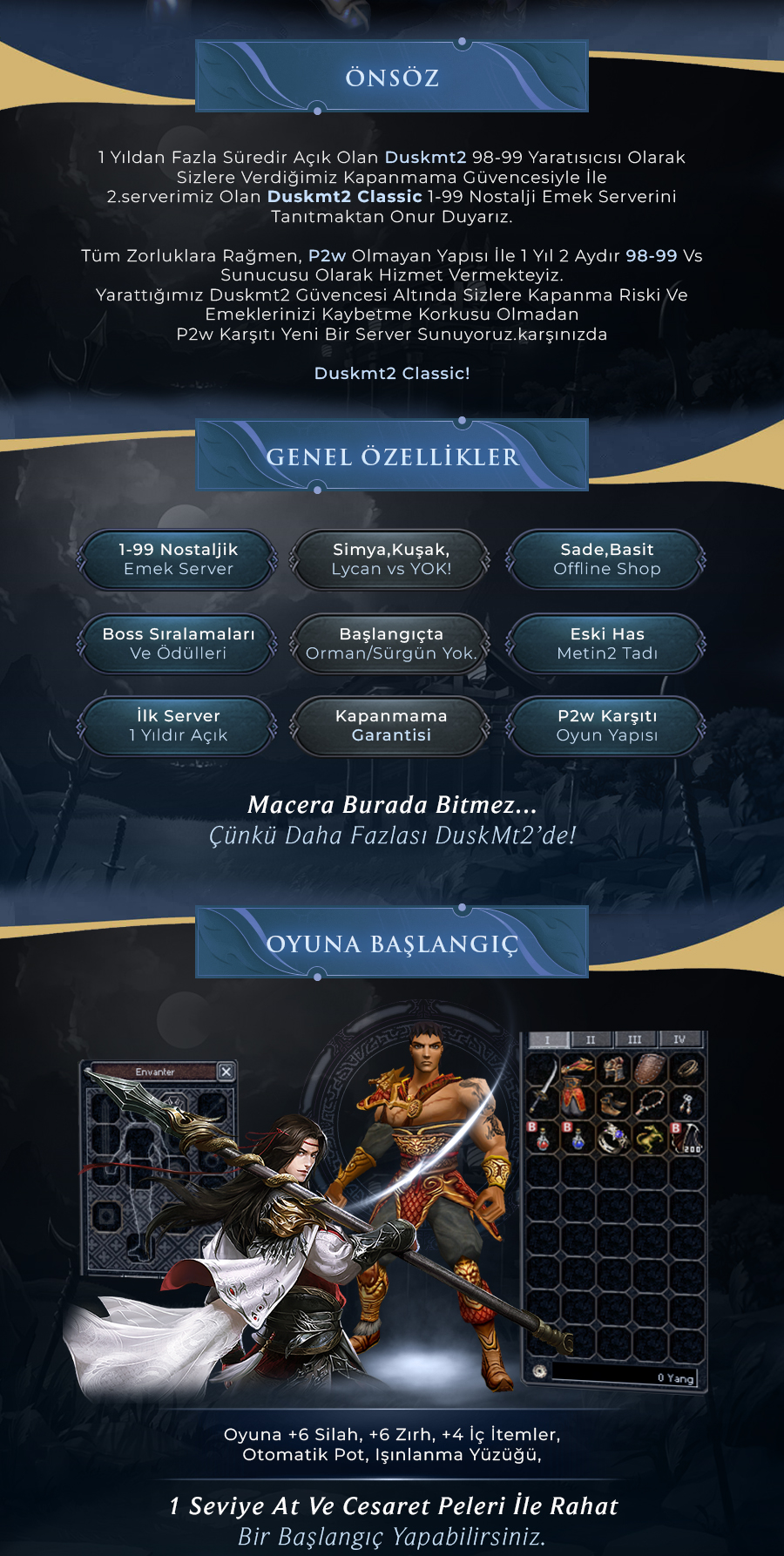 🎯 Level Aralığı: 1–99 🎮 Sunucu Tipi: Nostalji / Emek 🛡️ P2W Yok – Kapanmama Garantisi 📆 Açılış Tarihi: 1 Ağustos Cuma 🕘 Saat: 21:00 Eski Has Metin2 Tadı arayan herkesi DuskMt2 Classic’e bekliyoruz. Bugüne kadar güvenimizi kazananlara, bu kez bir efsane daha armağan ediyoruz.
